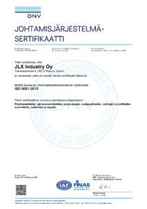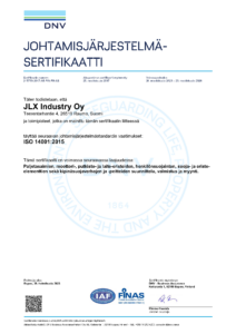 JLX Industry Oy:lle on myönnetty johtamisjärjestelmien sertifikaatit ISO 9001:2015- ja ISO 14001:2015 -standardien mukaan